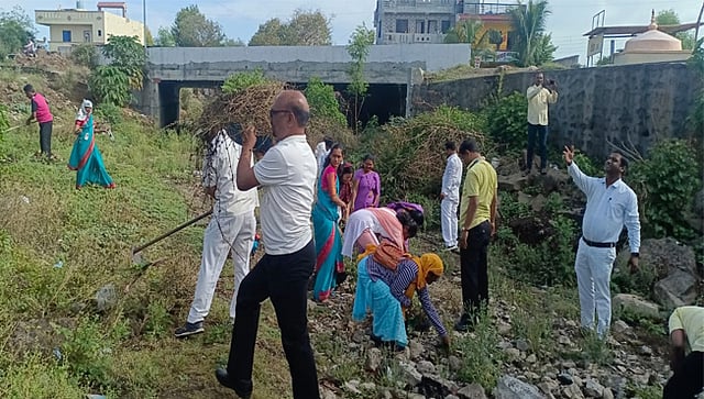 नांदगाव : गंगाधरी येथील नदी स्वच्छ करताना पंचायत समितीचे कर्मचारी. समवेत गटविकास आधिकारी गणेश चौधरी. (छाया : सचिन बैरागी)