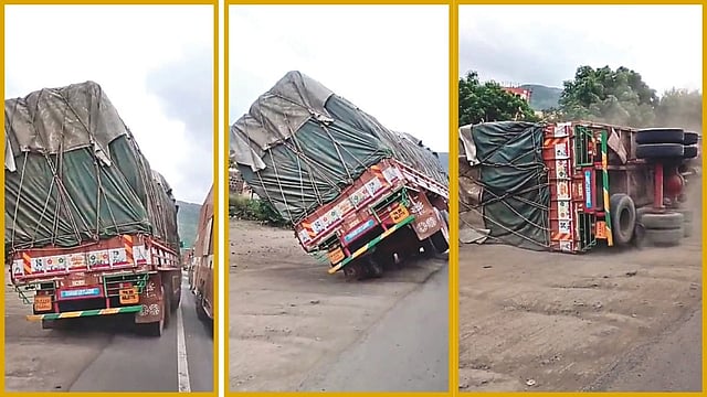या बाबत अधिक वृत्त असे, टीएन 28, एडी 2775 हा 16 टायर असलेला मालट्रक पुण्याकडे जात होता. वाहनात क्षमतेपेक्षा अतिरिक्त माल स्पष्टपणे दिसत होता. परिणामी, ट्रक एका बाजूने झुकला. त्यानंतरही चालकाने वाहन सुरक्षितपणे बाजुला थांबण्याएेवजी मार्गक्रमण सुरू ठेवले. हा धोकायदायक प्रकार पाहून दुचाकीस्वारांनी ट्रकचालकाला आवाज देत धोक्याची कल्पना दिली. मात्र, चालकाने त्याकडे काणाडोळा केला. ट्रकचालक इतरांना जीव धोक्यात घालत असल्याचे पाहून दुचाकीस्वारांनी त्याचे मोबाईलमध्ये चित्रीकरण सुरू केले. शिवाय ट्रकच्या डाव्या बाजूने इतर वाहनचालकांना जाण्यापासून रोखले. अखेर अंकाई किल्ला फाट्याजवळ धावता ट्रक पलटी झाला. सुदैवाने तिथे कुणीच नसल्याने अनर्थ टळला, मात्र ट्रक जर उजव्या बाजूने पलटी झाला असता तर मोठा बाका प्रसंग उभा ठाकला असता. या घटनेत बेजबाबदार ट्रकचालक जखमी झाला असून ट्रकचेदेखील मोठे नुकसान झाले आहे.