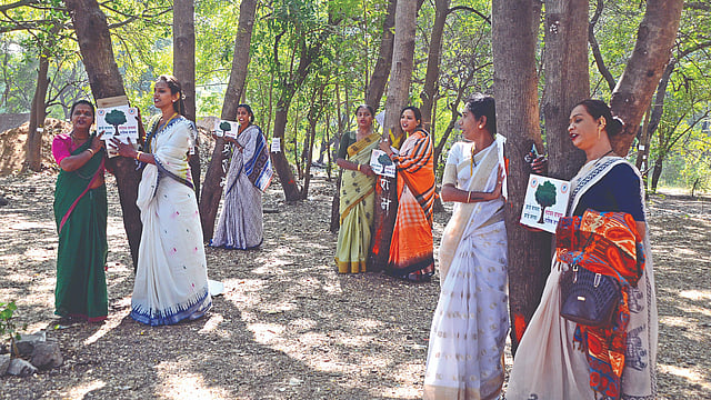 पंचवटी (नाशिक) : तपोवनातील वृक्षतोडीच्या विरोधातील आंदोलनास पाठींबा देण्यासाठी किन्नर समाजही उतरला असून, त्यांनी सोमवारी (दि. ८) तपोवनात वृक्षांभोवती साखळी धरली. प्रशासनाने वृक्षतोड निर्णय मागे घेतला नाही तर महापालिकेसमोर समोर टाळी बजाव आंदोलन छेडत कुंभमेळा मंत्री गिरीष महाजन व मनपा अधिकाऱ्यांना घेराव घालण्याचा इशारा त्यांनी दिला.