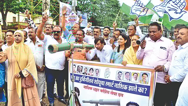 नाशिक : शहर काँग्रेस सेवा दलाने गुरुवारी प्रतीकात्मक दुर्बिणीने स्मार्ट नाशिकचा शोध घेत उपहासात्मक पद्धतीने महानगरपालिका व स्मार्ट सिटीच्या कारभाराचा निषेध नोंदवला. स्मार्ट सिटीच्या नावाखाली कोट्यवधी रुपयांची विकासकामे केली जात असल्याचा गाजावाजा केला जात आहे. मात्र त्यामुळे नाशिककरांना जीव गमवावा लागत असून, त्रास सहन करावा लागत असल्याचा आरोप काँग्रेसच्या वतीने करण्यात आला.