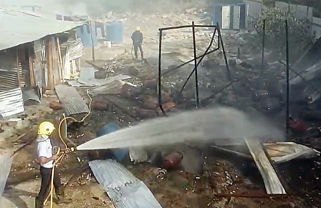 बुधवारी दुपारी गोदामातील सिलिंडरला आग लागली आणि एकापाठोपाठ दहा सिलिंडरचे स्फोट झाल्याने परिसर हादरला. स्फोटानंतर आगीचे लोळ झेपावल्याने परिसरात घबराट उडाली. त्याची झळ शेजारी असलेल्या मजुरांच्या झोपड्यांना पोहोचली. मजुरांच्या झोपड्या आणि गृहोपयोगी साहित्य आगीत भस्मसात झाले. या घटनेची माहिती मिळताचच्या जवानांनी घटनास्थळी धाव घेतली. आग भडकल्याने अग्निशमन दलाने जादा कुमक मागवली. अग्निशमन दलातील 30 जवानांनी पाण्याचा मारा करून नियंत्रण मिळवले. जवानांनी गोदामात साठवणूक केलेले 100 सिलिंडर बाजूला केल्याने अनर्थ टळला. आगीची घटना समजल्यावर वसाहतीतील महिला आणि मुले बाहेर पळाल्याने बचावले. स्फोटांमुळे परिसरात घबराट उडालीहोती. विमानतळ पोलिस ठाण्याचे वरिष्ठ पोलिस निरीक्षक आनंदराव खोबरे आणि कर्मचार्यांनी घटनास्थळी भेट दिली.