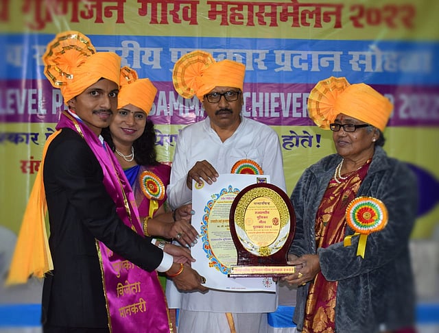 ऋतिक कुंभार यांना पुरस्कार प्रदान करताना शुभदा जाेशी आणि ह. भ. प. श्यामसुंदर महाराज साेन्नर-आळंदीकर आणि डाॅ. जे. सानिपीना राव.