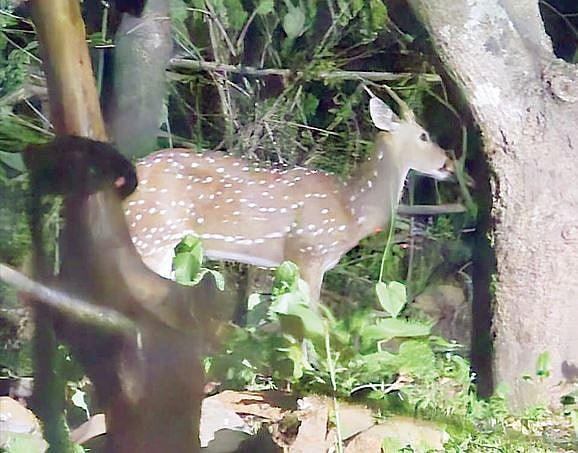 गेल्या महिन्यापासून हरीण रात्री आठच्या सुमारास जंगलातून गोठ्यात येत आहे. जनावरांसाठी ठेवलेले गवत खाऊन ते रात्रभर गोठ्यात मुक्काम करते आणि सकाळी सातच्या सुमारास निघून जाते. या हरणाचा रंग फिकट लाल असून त्यावर चंदेरी (पांढरे) ठिपके आहेत. त्याची दोन्ही शिंगे भरीव आहेत.