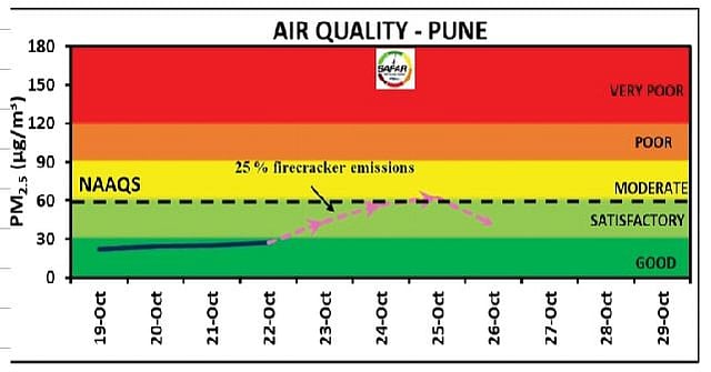 आयआयटीएमने घेतलेल्या नोंदीनुसार यंदा शहरावर बाष्पयुक्त वार्यांचा प्रभाव होता. तरीही लक्ष्मीपूजनाच्या दिवशी 24 ऑक्टोबर रोजी शहरातील शिवाजीनगर व कोथरूड भागात फटाक्यांची मोठी आतषबाजी झाल्याने त्या भागात इतर भागांच्या तुलनेत जास्त प्रदूषण नोंदवले गेले. मात्र, एकूण शहराची हवा मध्यम प्रकारच्या प्रदूषणात गणली गेली.