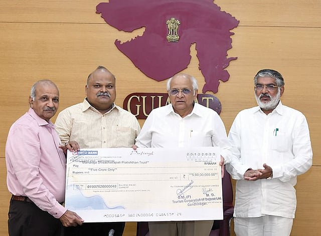 पुणे : पुढारी वृत्तसेवा : कै. शिवशाहीर बाबासाहेब पुरंदरे यांच्या संकल्पनेतून आणि महाराजा श्री शिवछत्रपती प्रतिष्ठानच्या वतीने नर्हे – आंबेगाव येथे साकारत असलेल्या शिवसृष्टीला गुजरात सरकारकडून 5 कोटी रुपयांची देणगी सुपूर्त करण्यात आली. महाराजा श्री शिवछत्रपती प्रतिष्ठानचे विश्वस्त विनीत कुबेर यांनी गुजरातचे मुख्यमंत्री भूपेंद्र पटेल यांच्याकडून मुख्यमंत्री निवासस्थानी विशेष निमंत्रितांच्या उपस्थितीत धनादेशाच्या स्वरूपात ही देणगी स्वीकारली. गुजरात राज्याचे वन व पर्यटनमंत्री मुलु बेरा, पर्यटन सचिव सौरभ पारधी, राष्ट्रीय स्वयंसेवक संघाचे ज्येष्ठ कार्यकर्ते संदीप जाधव आदी या वेळी उपस्थित होते.