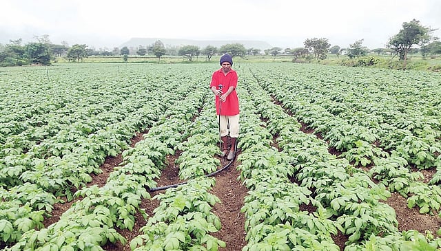 सातगाव पठार भागात बटाट्याची लागवड मोठ्या प्रमाणावर झाली आहे. या आधी झालेल्या पावसाने बटाटे तरारले. त्यानंतर पावसाने ताण दिल्याने शेतकरी हतबल झाले आहेत. उपलब्ध पाण्याचा काटकसरीने वापर करून ते पिकाला देण्याची धडपड शेतकरी करीत आहेत.