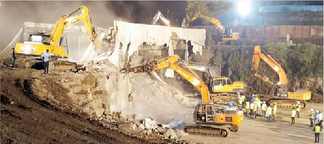 परंतु, वेळेआधीच संपूर्ण तयारी झाल्याने रात्री 1 वाजता स्फोट घडविण्यात आला. स्फोट होण्याच्या अर्धा तास आधी 'कुणीही 200 मीटरच्या आत थांबू नका, स्वत:चा जीव धोक्यात घालू नका,' अशा सूचना पोलिसांकडून देण्यात आल्या आणि त्यानंतर 20मिनिटात स्फोट झाला. मात्र, धुरळा खाली बसल्यानंतर पुलाचा काही भाग तसाच असल्याचे दिसून आले. एवढेच नव्हे, तर …कंपनीचा फलक असणारे कापडही तसेच दिसत होते. त्यानंतर लगेचच एक्सेव्हेटर, पोकलेंड, टिप्पर तातडीने पुलाकडे गेले आणि मलबा उपसण्यास सुरूवात केली. पुलाचा काही भाग तसाच राहिल्याने स्फोट अयशस्वी झाला का अशी शंका उपस्थितांमध्ये व्यक्त होत होती.