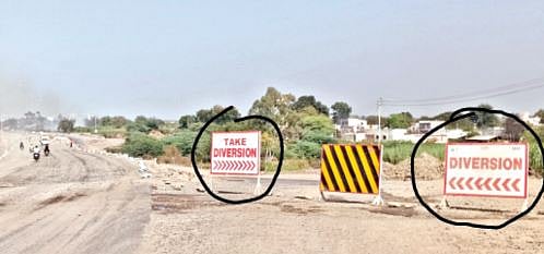 या ठिकाणी जुन्या रस्त्याकडे वळण्याच्या ठिकाणी शुक्रवारी रस्ता बंद करून चक्क दोन वेगवेगळे दिशादर्शक वळणेचे वेगवेगळे बाण असलेले फलक आडवे लावण्यात आले आहेत.