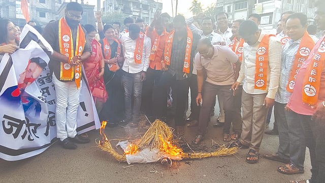 अलिबागः अलिबागचे आमदार महेंद्र दळवी यांच्याविरोधात माजी विरोधी पक्षनेते अंबादास दानवे यांनी चुकीचे व अपमानास्पद वक्तव्य केल्याचा आरोप करत शिवसेनेच्या कार्यकर्त्यांनी जोरदार संताप व्यक्त केला. या निषेध आंदोलनात दानवे यांच्या पुतळ्याला चपला घालत मारहाण करण्यात आली आणि त्यानंतर पुतळा पेटवून जाहीर निषेध नोंदवण्यात आला.