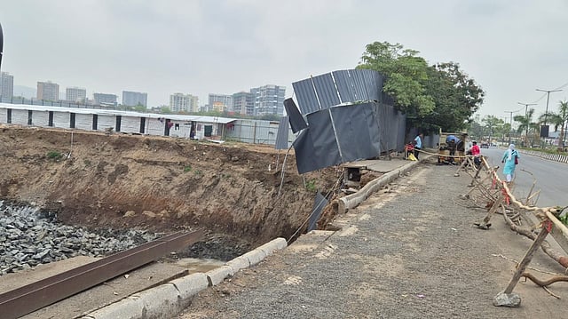 पनवेल : खांदेश्वर रेल्वे स्थानकासमोर सुरू असलेल्या एका बड्या बांधकाम व्यावसायिकाच्या प्रकल्पात मोठी दुर्घटना टळली आहे. बांधकाम व्यावसायिकाच्या निष्काळजीपणामुळे सुरू असलेल्या पायलिंग कामादरम्यान अचानक फुटपाथ आणि रस्ता खचला. या घटनेमुळे नागरिकांत मोठी खळबळ उडाली असून सुदैवाने कोणतीही जीवितहानी झालेली नाही.