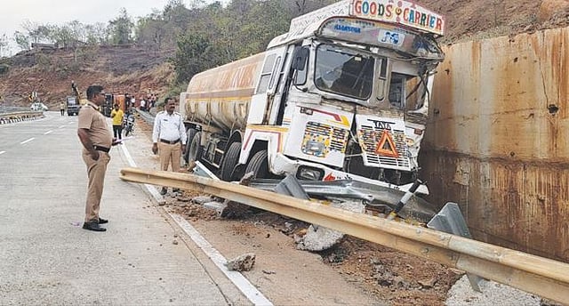 टँकर चालक नितीशमुनशी भारद्वाज वय 29 रा. उत्तरप्रदेश हा आपल्या ताब्यातील टँकर (एम एच 43 बी जी 2422) मिथेलॉन केमिकल घेऊन गोवा बाजू कडून मुंबई दिशेने असा जात होता.त्याचा वाहनावरील ताबा सुटून रस्त्याच्या अति वेगाने महामार्गालगतच्या लोखंडी रेलिंग वर धडक देऊन टँकर महामार्गालगत गटारात कलंडला आहे. सुदैवाने कोणतीही जीवित हानी झाली नाही.