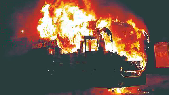 तरुण भारत स्टेडियमसमोरील वैरण अड्ड्याजवळ. सोमवारी सकाळी सहा वाजण्याच्या सुमारास. खासगी बस खाक.