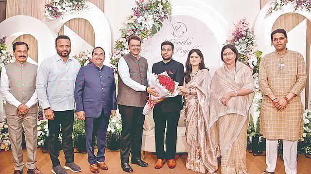 सांगली : भाजप नेते पृथ्वीराज पाटील यांचे पुत्र वीरेंद्रसिंह आणि चि. सौ. कां. प्राजक्ता यांच्या सांगलीतील शाही विवाह सोहळ्यानंतर मुंबई येथे आयोजित स्वागत समारंभात मुख्यमंत्री देवेंद्र फडणवीस यांच्यासह विविध क्षेत्रातील मान्यवरांनी नवदाम्पत्यास शुभाशीर्वाद आणि शुभेच्छा दिल्या आणि पाटील कुटुंबीयांशी संवाद साधला.