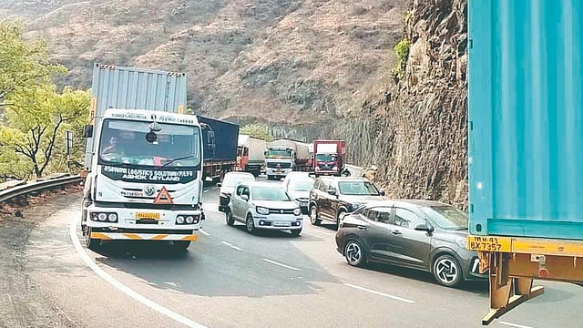खंबाटकी घाटातील दत्त मंदिराजवळील वळणावर रस्ता अरुंद असून चढाचा असल्याने येथे अवजड वाहने नेहमीच बंद पडण्याचे प्रकार घडतात. त्यामुळे एक लेन बंद होऊन वाहतूक एकेरी मार्गाने सुरू ठेवावी लागते. रविवारी सकाळी साडेसातच्या सुमारास दत्तमंदीरा जवळ माल ट्रक बंद पडला. त्यामुळे वाहतुकीस अडथळा आल्याने एकेरी वाहतूक धीम्या गतीने सुरु होती. एकच लेन सुरु असल्याने घाटात वाहनांच्या काही काळ रांगा लागल्या होत्या.