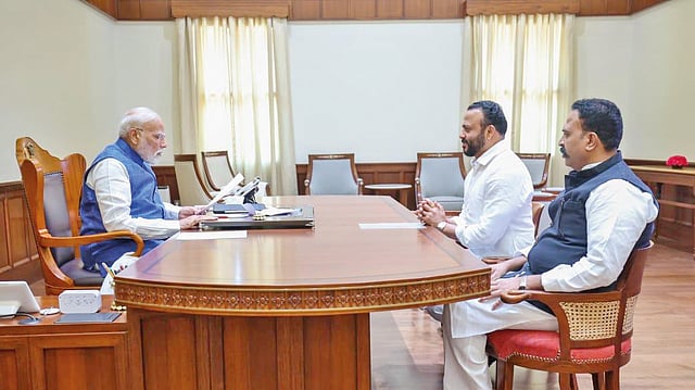 खटाव : नवी दिल्ली येथे महाराष्ट्राचे ग्रामविकास व पंचायत राजमंत्री जयकुमार गोरे यांनी गुरुवारी नवी दिल्ली येथे पंतप्रधान नरेंद्र मोदी यांची भेट घेतली. या भेटीत जिहे-कठापूर आणि उरमोडी पाणीयोजना, म्हसवड एमआयडीसी तसेच राज्यातील महत्त्वाच्या प्रकल्पांच्या मंजुरी व मंजूर प्रकल्पांच्या कामांना गती देण्याविषयी सविस्तर चर्चा झाली. यावेळी माजी खासदार रणजितसिंह नाईक निंबाळकर उपस्थित होते.