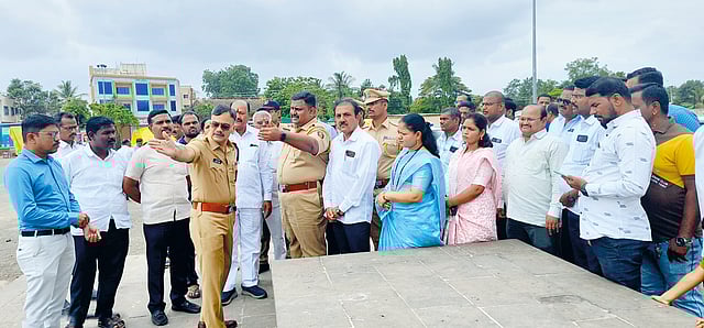यावेळी तुषार दोशी म्हणाले, माऊलींचा पालखीस सोहळा यशस्वीपणे पार पाडण्यासाठी नियोजन केले जात आहे. दर्शन रांगासंदर्भात लवकर जिल्हाधिकारी संतोष पाटील यांच्यासमवेत पाहणी केल्यानंतर निर्णय घेतला जाईल. माऊलींच्या पालखी सोहळ्यावर असलेल्या दिंड्यांना योग्य ते प्रकारचे संरक्षण व वाहतूक व्यवस्थेसाठी बंदोबस्त वाढवण्यात आला आहे. निरा नदीच्या दत्तघाटावरही बॅरिकेटींग होणार आहे, असेही ते म्हणाले. यावेळी विविध खात्यांचे अधिकारी व कर्मचारी उपस्थित होते. लोणंद पालखी तळाची पाहणी करताना एसपी तुषार दोशी, नगराध्यक्ष मधुमती गालिंदे, गणीभाई कच्छी, डीवायएसपी राहुल धस व इतर.