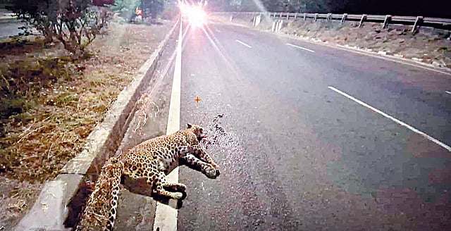 सातारा : पुणे-बंगळूर महामार्गावर कराडकडून साताऱ्याच्या दिशेने जाणाऱ्या लेनवर रविवारी पहाटे अज्ञात वाहनाच्या धडकेत बिबट्याचा जागीच मृत्यू झाला. ही धडक इतकी जोरात होती की बिबट्याचा चेहरा पूर्णपणे तुटला. वाहनधारक वाहन घेऊन पसार झाला आहे. ही दुर्घटना साताऱ्याजवळील खिंडवाडी येथे महामार्गावर घडली.