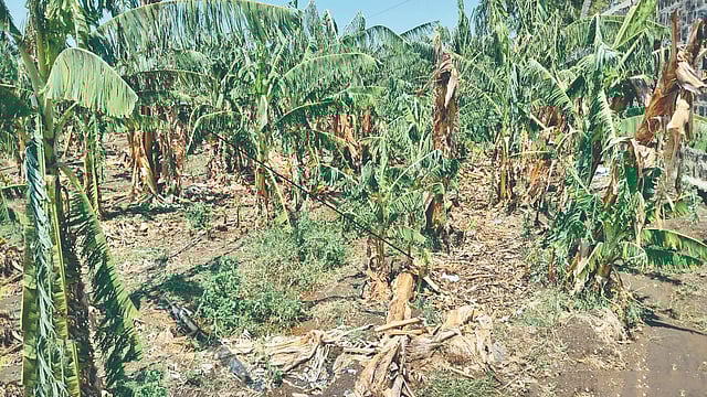 मळोली : नूतन वर्षाच्या पहिल्याच दिवशी अवकाळी पावसाने मळोलीसह परिसरात वादळी वाऱ्यासह गारांचा पाऊस पडल्याने परिसरातील केळी, द्राक्ष, गहू, हरभरा व ज्वारी या पिकांचे अतोनात नुकसान झाले. अचानक आलेल्या या पावसाने शेतकरी पुन्हा एकदा नुकसानीत गेला आहे.
