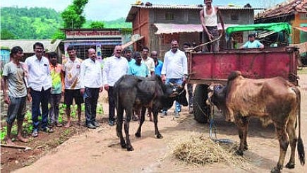 दानशूर व्यक्तींच्या हातून एकत्रित झालेल्या निधीतून नव्या बैलजोडीची खरेदी गोविंद तुका खाकर यांना करून देण्यात आली.  pudhari photo