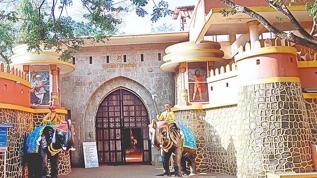 येथील मंदिरात शिवरायांचा अश्वारूढ पुतळा आहे. संत तुकाराम, संत रामदास, संत नामदेव, तसेच गोमातेचे मंदिर आहे. पायदळातील शिपाई, घोडेस्वार, बुरूज, टेहळणी करणारे शिपाई, पहारेकरी यांचा गराडा येथे पाहायला मिळतो आणि आपण शिवकालात गेल्याचा भास होतो. नेताजी पालकर यांचा इतिहास, सुरतेवरची स्वारी असे अनेक प्रसंग उभे केले आहेत. ते पाहताना शिवकाळ समोर येतो.