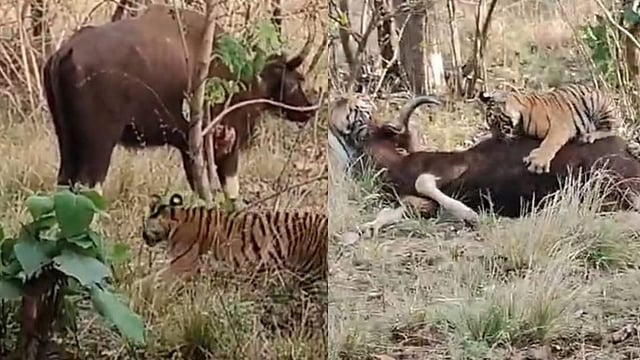 गवा रेड्याच्या शिकारीची ही घटना जुनोना बफर झोनमधील असल्याचे सांगितले जात आहे. एका गवा रेड्याचे कुरणात शांतपणे चरणे सुरू होते. तिथे तीन वाघाचे बछडे शिकारीसाठी हळूहळू तिच्या दिशेने सरकू लागले. जंगलातील निसर्गनियमाप्रमाणे शिकारीसाठी ही एक नैसर्गिक प्रक्रिया होती. बछड्यांनी गवा रेड्याला हेरले आणि त्याच्यावर वारंवार झडप घालण्याचा प्रयत्न केला.