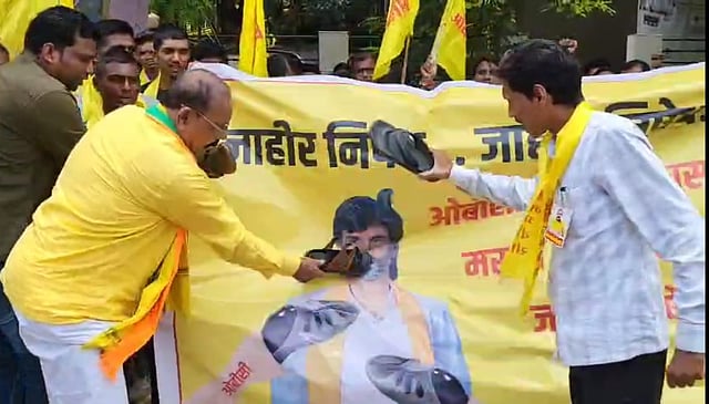 चंद्रपूर : मराठा समाजाला ओबीसीतून आरक्षण मिळावे यासाठी मुंबईला आझाद मैदानावर आंदोलन करण्यासाठी निघालेल्या मनोज जरांगेचा जाहीर निषेध करण्यात आला. स्थानिक दीक्षाभूमी चौकात आज (दि.२६) ला भारतीय जनता पार्टी ओबीसी मोर्चाचे महाराष्ट्र प्रदेश उपाध्यक्ष डॉ.अशोक जीवतोडे यांच्या नेतृत्वात निषेध आंदोलन करण्यात आले. यावेळी मनोज जरांगेच्या प्रतिमेला चप्पल मारून निषेध नोंदविण्यात आला. आंदोलनात मोठ्या संख्येने ओबीसी समाजबांधव उपस्थित होते.