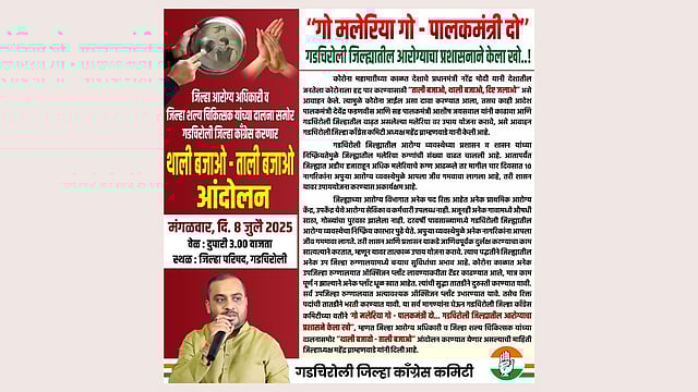 एकूणच आरोग्य व्यवस्था खिळखिळी झाली असून, शासन व प्रशासनाचे लक्ष वेधण्यासाठी काँग्रेस पक्ष मंगळवारी ८ जुलैला 'गो मलेरिया गो…' अशा घोषणा देत 'थाली बजाव' आंदोलन करण्यात येणार असल्याचे जिल्हाध्यक्ष महेंद्र ब्राम्हणवाडे यांनी म्हटले आहे.