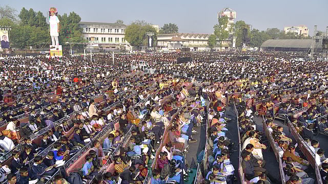 हनुमान नगर येथील ईश्वर देशमुख शारीरिक शिक्षण महाविद्यालयाचे भव्य पटांगण विविधरंगी शालेय पोशाख परिधान केलेल्या विद्यार्थ्यांनी फुलून गेले होते. सकाळी 7 वाजेपासून विद्यार्थी कार्यक्रमस्थळी यायला सुरुवात झाली. 8 वाजेपर्यंत 230 बसेसमधून हजारो विद्यार्थी पटांगणावर उतरले. त्यांच्यासोबत शिक्षक, मुख्याध्यापक, शाळासंचालकदेखील मोठ्या संख्येने कार्यक्रमस्थळी पोहोचले.