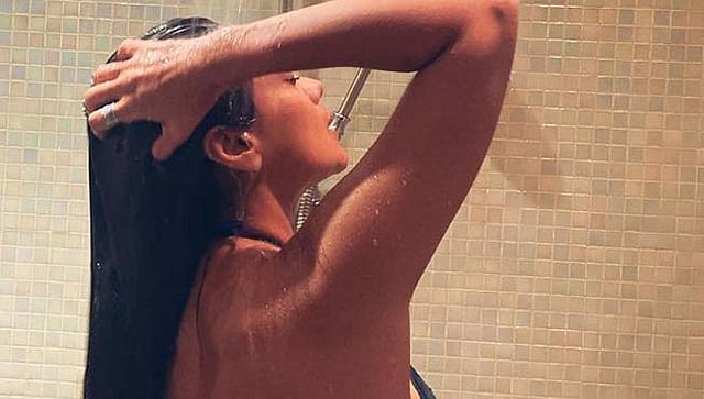 या फोटोंमध्ये ती बाथरूममध्ये शॉवर घेताना दिसतेय. मेघा निळ्या रंगाच्या बिकिनीत आहे. पण, ती पाठमोरी उभारलेली दिसते.