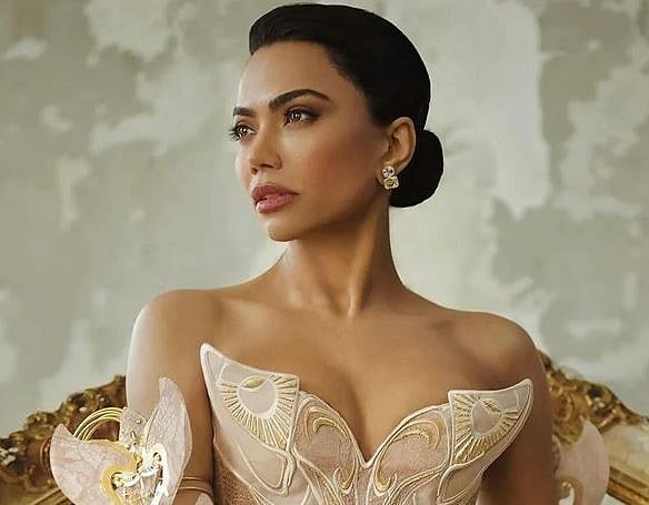 भारतात डिझायनर आयरिस व्हॅन हर्पेनच्या टीमकडून तयार करण्यात आलेल्या फ्लोर-लेंथ ड्रेसमध्ये एक शानदार फुलपाखरूच्या आकाराचा कोर्सेट लावलं होतं. ड्रेस मागून खूप लॉन्ग होता.