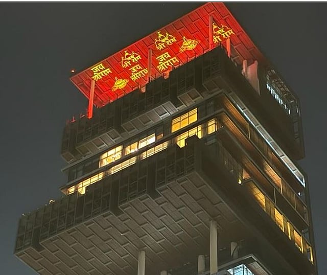 रामलल्ला प्राणप्रतिष्ठा सोहळ्यापूर्वी मुकेश अंबानी यांचे निवासस्थान 'अँटिलिया' विशेष पद्धतीने सजवण्यात आले आहे. 'अँटिलिया'च्या सर्वात वरच्या मजल्यावर दिवे लावण्यात आले आहेत. त्यावर जय श्री राम लिहिले आहे. यासोबतच राम मंदिराचे चित्रही दिसत आहे. रामलल्ला प्राणप्रतिष्ठा सोहळ्यापूर्वी 'अँटिलिया' राममय झाल्याचे दिसत आहे.