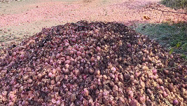 कळवण : पाळे ते हिंगवे रस्त्यावर चाळीतील कांदा देखील सडल्याने शेतकऱ्यानी कांदा फेकून दिला. (छाया: बापू देवरे)