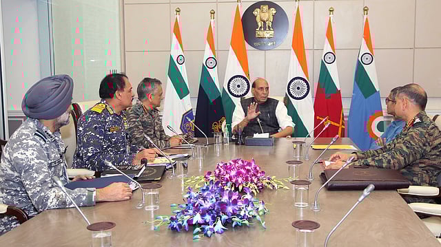 नवी दिल्ली : भारत आणि पाकिस्तानमधील तणाव वाढत असून युद्धजन्य परिस्थिती निर्माण झाली आहे. दरम्यान, ८ मेच्या मध्यरात्री भारताने पाकिस्तानला दणका देत त्यांचे हल्ले परतवून लावले. त्यानंतर शुक्रवारी संरक्षण मंत्री राजनाथ सिंह यांनी भारताच्या तिन्ही दलांचे प्रमुख, संरक्षण सचिव, डीआरडीओ प्रमुख आणि लष्कर प्रमुख (सीडीएस) अनिल चौहान यांच्यासोबत एक बैठक घेतली.
