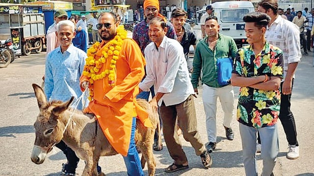 भोपाळ; वृत्तसंस्था : बर्हाणपुरातील अपक्ष उमेदवार प्रियांक सिंह ठाकूर यांनी गाढवावर स्वार होऊन मिरवणुकीद्वारे आपला उमेदवारी अर्ज दाखल केला. या प्रकाराची मध्य प्रदेश राज्यात एकच चर्चा आहे. निवडणुकीपूर्वी काहीच दिवस मतदारांची दखल घेणारे नेते निवडणुकीनंतर 5 वर्षे मतदारांना गाढव समजतात, हे सांगण्यासाठीच मी गाढवावरून उमेदवारी अर्ज दाखल करायला गेलो, असे प्रियांक सिंह यांचे म्हणणे आहे.