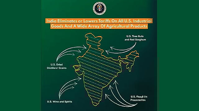नवी दिल्ली; वृत्तसंस्था : भारत आणि अमेरिका यांनी अंतरिम व्यापार करारासाठी शनिवारी एक आराखडा जाहीर केल्यानंतर अमेरिकेच्या व्यापार प्रतिनिधी कार्यालयाने ऑनलाईन प्रसिद्ध केलेल्या एका नकाशाने जगाचे लक्ष वेधून घेतले.