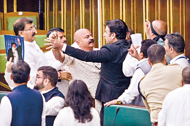 भाजप आमदारांनी ‘भारत माता की जय’ आणि ‘वंदे मातरम्’च्या घोषणा दिल्या. जम्मूसाठी नॅशनल लॉ युनिव्हर्सिटीच्या मागण्या मांडल्या. ‘अमेरिका हाय-हाय’ घोषणाही ऐकू आल्या. गोंधळ वाढल्याने 20 ते 25 मिनिटांतच कामकाज अर्ध्या तासासाठी स्थगित करावे लागले. काँग्रेस आमदारांनी पंतप्रधान नरेंद्र मोदी यांच्याविरोधात घोषणा दिल्यानंतर भाजप आमदारांनी राहुल गांधींना पप्पू असे संबोधत आक्षेपार्ह वक्तव्ये केल्याने वातावरण चिघळले. दोन्ही बाजूंचे आमदार आमनेसामने येत धक्काबुक्कीपर्यंत परिस्थिती पोहोचली. गोंधळ नियंत्रणाबाहेर जात असल्याचे पाहून मार्शल्स आणि सुरक्षारक्षकांना हस्तक्षेप करावा लागला, अन्यथा हातघाईची शक्यता निर्माण झाली होती.