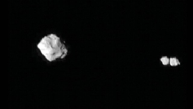 न्यूयॉर्क : 'नासा'च्या ल्युसी मिशनमधून डिंकिनेश नावाच्या लघुग्रहाबाबत नवी माहिती समोर आली आहे. हे यान 1 नोव्हेंबरला लघुग्रहाजवळून गेल्यावर त्याच्याभोवती एक छोटा चंद्र फिरत असल्याचे आढळून आले होते. आता अन्य छायाचित्रांमधून आश्चर्यकारक वस्तुस्थिती समोर आली आहे. या लघुग्रहाभोवती एक नव्हे तर एकमेकाला खेटून असलेले दोन चंद्र फिरत असल्याचे स्पष्ट झाले.