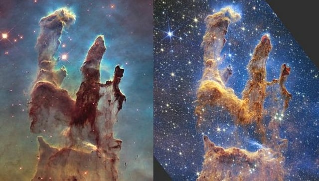 छायाचित्रात दिसणारे सृष्टीस्तंभ (Pillars of Creation) आपल्या आकाशगंगेच्या गरुड नेब्युलामध्ये पृथ्वीपासून 6,500 प्रकाशवर्षे अंतरावर आहेत. हबल स्पेस टेलिस्कोपने या खांबांचे छायाचित्रण केले आहे. यापूर्वी या दुर्बिणीने 1995 आणि 2014 मध्ये असे चित्र घेतले होते. परंतु एका वर्षापूर्वी अंतराळात प्रक्षेपित केलेल्या नवीन जेम्स वेब स्पेस टेलिस्कोपच्या इन्फ्रारेड क्षमतेमुळे, स्तंभांच्या अस्पष्टतेतूनही अनेक नवीन तारे तयार होताना दिसत आहेत.