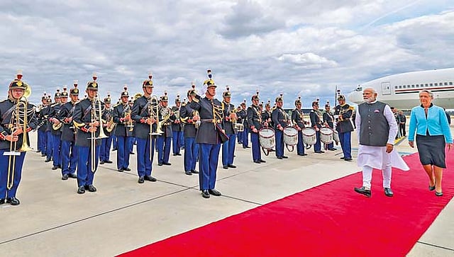 पॅरिस : भारत-फ्रान्स यांच्यातील धोरणात्मक भागीदारीला पंचवीस वर्षे पूर्ण होत असल्याच्या पार्श्वभूमीवर, पंतप्रधान नरेंद्र मोदी दोन दिवसांसाठी पॅरिसला पोहोचले असून, फ्रान्सच्या पंतप्रधान एलिझाबेथ बॉर्न यांनी पॅरिस विमानतळावर त्यांचे जोरदार स्वागत केले. विमानतळावर मोदींसाठी खास रेड कार्पेट अंथरण्यात आले होते. यावेळी त्यांना 'गार्ड ऑफ ऑनर'ने सन्मानित करण्यात आले. दरम्यान, या दौर्यात राफेल विमाने आणि पाणबुड्यांच्या खरेदीविषयी दोन्ही देशांत अनेक महत्त्वपूर्ण करार होणार आहेत.