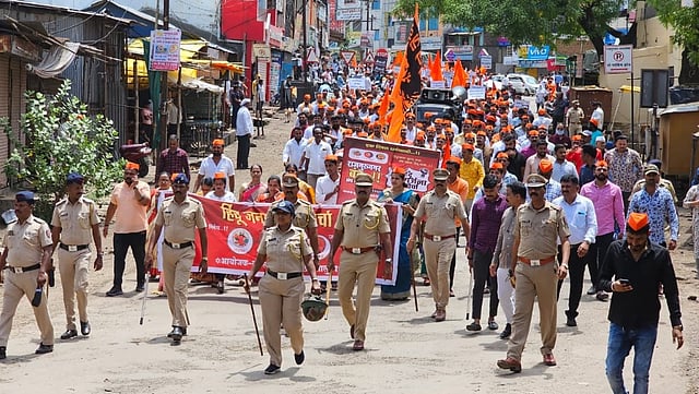 राजगुरूनगर(पुणे); पुढारी वृत्तसेवा : कडुस,(ता खेड) येथे एकादशीच्या दिवशी गोहत्या झाल्याच्या निषधार्थ सोमवारी( दि. ३ जुलै) राजगुरूनगर शहरात कडकडीत बंद पाळण्यात आला. शहरातील अत्यावश्यक सेवा वगळता सर्व व्यवहार दिवसभर बंद ठेवण्यात आले. लहानमोठ्या सर्वच व्यापाऱ्यांनी सकाळपासून उत्स्फर्तपणे दुकाने बंद ठेवली होती. सर्व हिंदुत्ववादी संघटनांच्या वतीने राजगुरूनगर मध्ये निषेध मोर्चा काढण्यात आला. या मोर्चात युवक मोठ्या संख्येने सहभागी झाले होते. राजगुरूनगर येथील बाजार समितीच्या आवारातील छत्रपती शिवाजी महाराजांच्या पुतळ्याला पुष्पहार अर्पण करून मोर्चाची सुरुवात झाली.