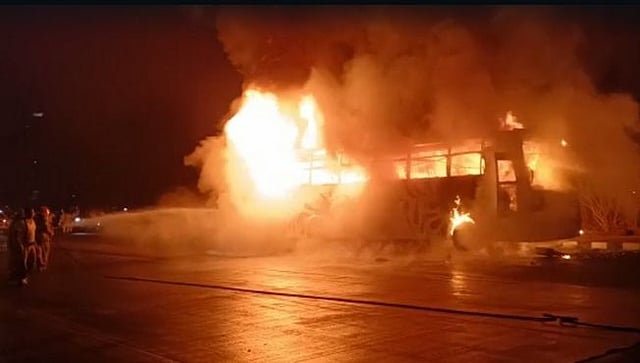 पनवेल; विक्रम बाबर : सायन पनवेल महामार्गावर खारघर येथील कोपरा पुलाजवळ टूर्स अँड ट्रॅव्हल्स बसला मध्यरात्री बारा वाजेच्या सुमारास अचानक आग लागली. मात्र चालकाने प्रसंगावधान दाखवत बस थांबवून प्रवाशांना बाहेर काढल्याने जिवितहानी टळली. अग्नीशमन विभागाने बसला लागलेल्या आगीवर नियंत्रण मिळवलं आहे.