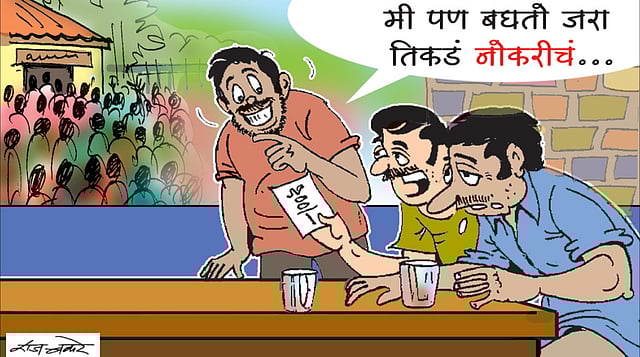 पांडू : तूपण जा ना तिकडे नोकरीला. शेजारी-शेजारी दुकानांना परवाने देतात कसे. शासनाला लोकांची गय नाही. रद्द करावे असे परवाने.