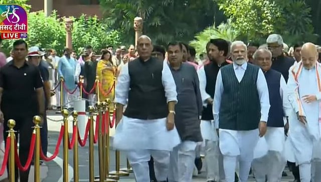 या प्रसंगी पंतप्रधान नरेंद्र मोदींसह संसदीय कामकाज मंत्री प्रल्हाद जोशी, केंद्रीय गृहमंत्री अमित शहा, संरक्षण मंत्री राजनाथ सिंह, केंद्रीय मंत्री पियुष गोयल, नितीन गडकरी आणि इतर खासदार जुन्या संसदेच्या इमारतीतून बाहेर पडत नवीन संसद इमारतीकडे जात असताना दिसत आहे. यांच्या पाठीमागून भाजपचे अनेक राज्यसभा आणि लोकसभा खासदार देखील दिसत आहेत. या ऐतिहासिक क्षणांची छायाचित्र अनेक खासदार टिपत असताना दिसले. (New Parliament Building)