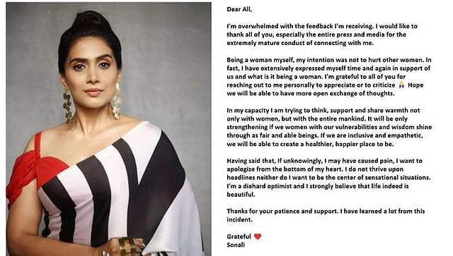 मी स्वतः एक स्त्री असल्यामुळे इतर महिलांना दुखवण्याचा माझा हेतू नव्हता. खरं तर, एक स्त्री असणं म्हणजे काय ते मी वेळोवेळी व्यक्त केलं आहे. माझ्यावर वैयक्तिकरित्या प्रशंसा किंवा टीका करण्यासाठी पोहोचल्याबद्दल मी तुम्हा सर्वांचा आभारी आहे. आशा आहे की विचारांची अधिक मुक्त देवाणघेवाण करू.