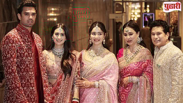 विवाहसोहळ्यात अर्जुन आणि सानिया यांचा लूक अत्यंत रॉयल आणि मोहक दिसत होता. अर्जुनने गडद लाल रंगाची, सोनेरी नक्षीकाम केलेली शेरवानी परिधान केली होती. यासोबत मॅचिंग कुर्ता, पांढरी ट्राउझर आणि ब्राऊन लोफर्स असा त्याचा क्लासिक अंदाज सर्वांचे लक्ष वेधून घेत होता.