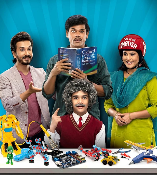 या मोशन पोस्टरचा नवखेपणा म्हणजे, यात आर्यन मेंघजी हा बाल कलाकार आईनस्टाईनच्या भन्नाट रुपात अनेक गॅझेटच्या गराड्यात बसलेला दिसतो. समोर एक पेंड्यूलम म्हणजे लोलक हलताना दिसतो. त्यावर मराठी व इंग्लिश आद्याक्षरे लिहिलेली आहेत. त्यात एक आयडिया त्याच्या डोक्यात येते आणि तिची चमक त्याच्या चेहऱ्यावर दिसते आणि त्याचे डोळे चकाकतात. मग गंमत सुरू होते. एक एक कलाकार दिसू लागतात. नंदिता पाटकर 'टॉक इन इंग्लिश' लिहिलेले हेल्मेट घालून येते. अभिजित खांडकेकर मुलाचे कौतुक करतो आणि पहिल्यांदाच वडिलांच्या भूमिकेतील सिद्धार्थ जाधव मोठ्या तन्मयतेने इंग्लिश-मराठी डिक्शनरी वाचताना दिसतो. मग शेवटी एक विमान उडत जाते आणि समोर शब्द येतात – 'मीट द न्यू चाईनस्टाईन!'
