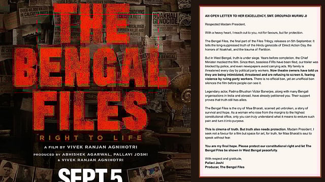 पश्चिम बंगालमध्ये 'द बंगाल फाइल्स' प्रदर्शित करण्यासाठी निर्माती-अभिनेत्री पल्लवी जोशी यांनी राष्ट्रपतींना खुले पत्र लिहिले आहे. पल्लवी जोशी यांनी त्यांच्या सोशल मीडियावर राष्ट्रपती द्रौपदी मुर्मू यांना उद्देशून लिहिलेली एक पत्र शेअर केली.