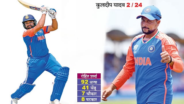 अँटिग्वाच्या मैदानात पावसाळी वातावरणात ऑस्ट्रेलियाने नाणेफेक जिंकून भारताला फलंदाजी दिली. वन डे वर्ल्डकप फायनलचा सर्व राग रोहितने ऑस्ट्रेलियन गोलंदाजांवर काढला. विराट कोहली शून्यावर बाद झाल्यानंतर रोहितने अचानक गिअर बदलला आणि मिचेल स्टार्कच्या एका षटकात 29 धावा कुटल्या. दरम्यान, ऋषभ पंतही (15) मोठा फटका मारण्याच्या नादात बाद झाला. ज्या स्टार्कला रोहितने धुतले होते, त्यानेच हिटमॅनची विकेट घेतली. रोहित 41 चेंडूंत 7 चौकार व 8 षटकारांसह 92 धावांवर त्रिफळाचीत झाला. शिवम दुबे व सूर्या यांनी धावगती वाढवण्याची जबाबदारी पार पाडली. या दोघांची 19 चेंडूंत 32 धावांची भागीदारी स्टार्कने तोडली. सूर्या 16 चेंडूंत 3 चौकार व 2 षटकारांसह 31 धावांवर झेलबाद झाला.