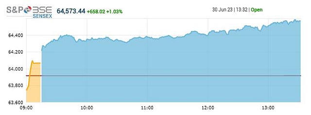 पुढारी ऑनलाईन : अमेरिकेच्या मजबूत आर्थिक डेटामुळे मंदीची भीती कमी झाली आहे. जागतिक स्तरावरील सकारात्मक संकेतांमुळे भारतीय शेअर बाजारात आजही तेजीचे वातावरण कायम राहिले. आज शुक्रवारी (दि.३०) सर्व प्रमुख क्षेत्रांमध्ये जोरदार खरेदी दिसून आली. आज दुपारच्या व्यवहारात सेन्सेक्स (Sensex) ६३४ अंकांनी वाढून ६४,५५० वर पोहोचला. तर निफ्टी (Nifty) १७२ अंकांच्या वाढीसह १९,१४४ वर व्यवहार करत होता. याआधीच्या सत्रात सेन्सेक्स ६३,९१५ वर बंद झाला होता. आज तो ६४,०६८ वर खुला झाला. त्यानंतर त्याने आज ६४,५०० अंकांचा आकडा पार करत रेकॉर्ड ब्रेक कामगिरी कायम ठेवली. बाजारातील तेजीत आयटी आणि बँकिंग शेअर्स आघाडीवर आहेत. (Stock Market Updates) गेल्या तीन सत्रांत सेन्सेक्स जवळपास १५०० अंकांनी वाढला आहे. यामुळे पहिल्यांदाच त्याने आजच्या व्यवहारात ६४,५०० वर झेप घेतली.