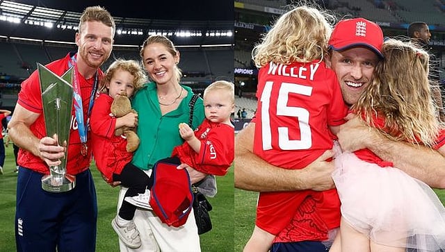 पुढारी ऑनलाईन डेस्क : टी२० विश्वचषक २०२२ च्या अंतिम सामन्यात इंग्लंडने पाकिस्तानचा ५ गडी राखून पराभव केला. सॅम करनचा भेदक मारा आणि बेन स्टोक्सच्या दमदार खेळीच्या जोरावर इंग्लंडने हा विजय संपादन केला. (T20 World Cup Final) दरम्यान, टी-२० विश्वचषक जिंकल्यानंतर इंग्लंडच्या खेळाडूंनी जोरदार सेलिब्रेशन केले. यावेळी खेळाडूंनी हा विजय आपल्या कुटुंबीयांसोबत सेलिब्रेट केला. आनंदोत्सव साजरा करत असलेल्या खेळाडूंचे फोटो आयसीसीने ट्वीटरद्वारे शेअर केले आहेत.